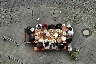 A dinner party where mutual friends met through objects.